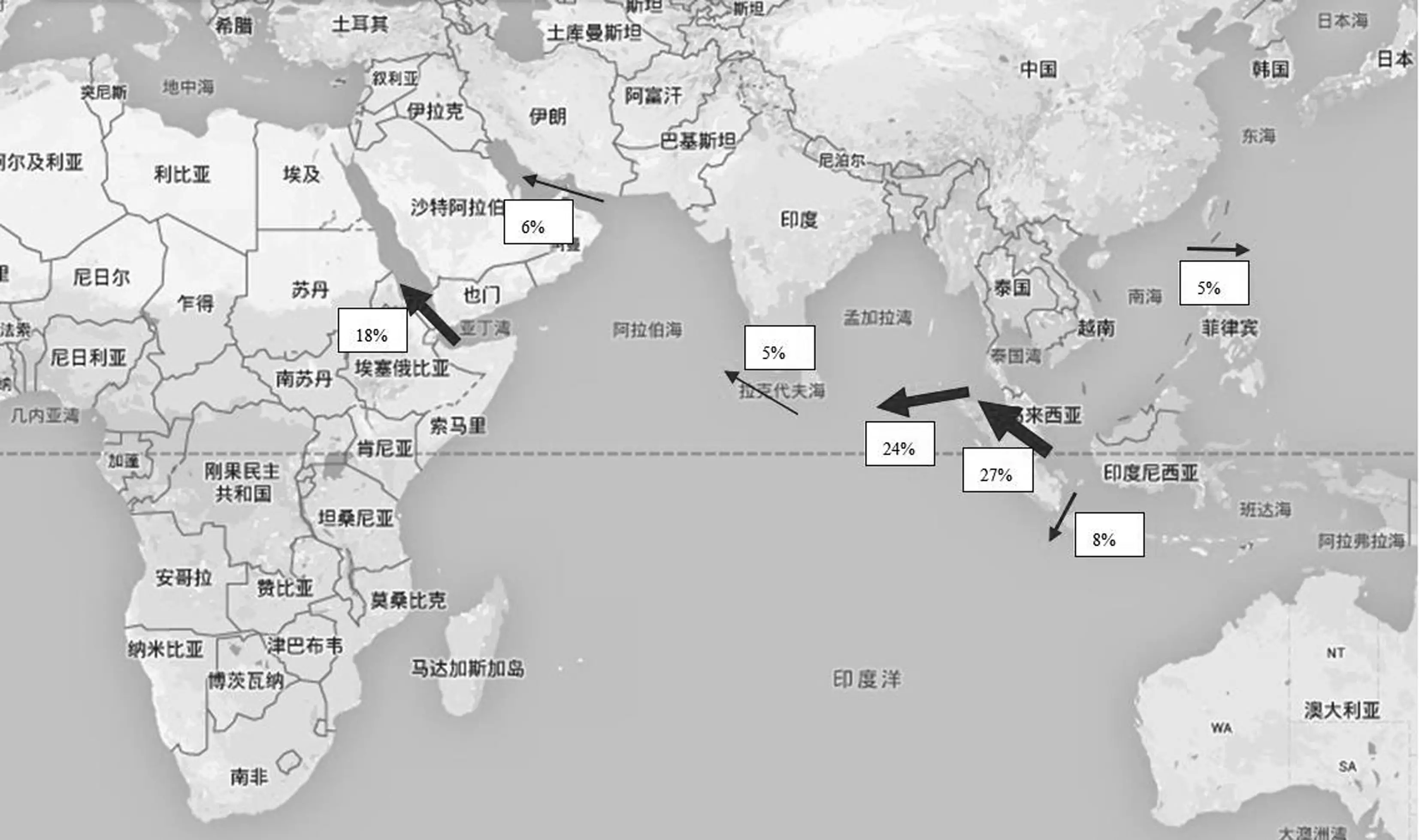 通过图1可以发现,“21世纪海上丝绸之路”比较集中地承载了我国对外贸易物流。“南海—马六甲海峡—格雷特海峡—孟加拉湾—斯里兰卡附近海域—阿拉伯海—曼德海峡—红海—苏伊士运河—地中海”之间的海上航线构成了其主要通道。这条通道起始端承载的物流价值占我国对外贸易海上运输总额的59%,其末端承载的物流价值仍高达16%。以该通道为主线,还有几条分支通道也比较重要,包括经南海到大洋洲的海上通道、沿印度半岛西侧到达波斯湾的海上石油运输线、横穿印度洋绕行非洲经大西洋到欧洲的大型船舶通道。
