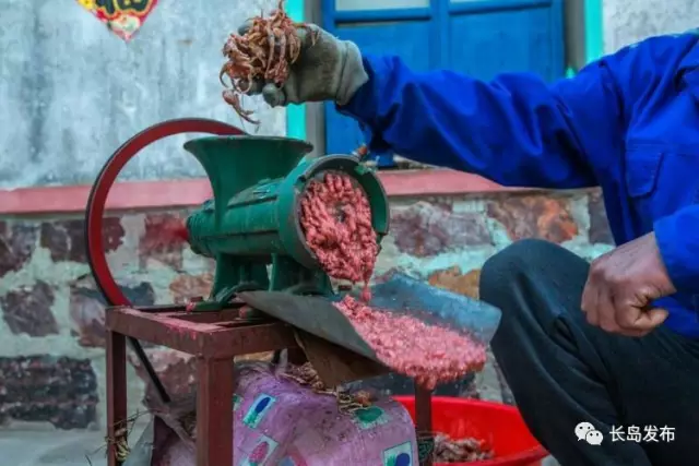 出海忙了一天的渔民夜晚加班,将当天的海怪头部粉碎成酱,粉碎后的海怪还得用纱布拧挤,去除残渣,只保留汁液部分。