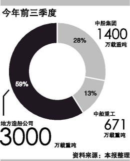 中国船舶市场工业研究中心数据显示,今年前三季度,中船集团、中船重工分别接新单1400万载重吨、671万载重吨,占比为28%和13%。地方造船公司共接新单3000万载重吨,占全部新订单的59%。其中江苏熔盛重工、江苏新世纪集团分别承接了389万载重吨、335万载重吨的船舶新订单。