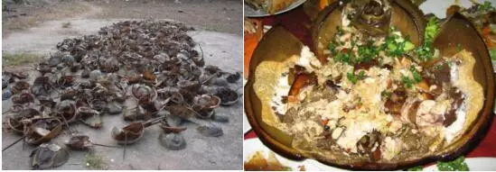很多人不知鲎为何物,不识鲎的相貌。见到这种“三不像”生物后,大为惊奇,无以名之,便称它为“海怪”。细分一下,把它称之为“海怪”的人,大多是对鲎毫无所知,还有一部份则是有图谋的。笔者曾在海南省临高县城一海鲜店见到水箱内摆放几只鲎,服务员竭力推荐:“这是本地特产海怪,每斤200元,很难吃到,要不要品尝?”。被称之为“海怪”,自然会引起一些土豪或吃货们猎奇尝鲜,以满足食用珍稀野生动物为荣心理,于是中华鲎这种珍稀海洋动物便堂而皇之摆上宴席。