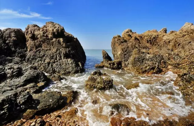 南黄岛的鱼多还有一个神奇的传说呢,相传有一年春天乌鱼求偶季节,一位老汉用线绳缚着一只活乌鱼扔到水中,它的同类立时聚集,把岸边海水映染成了一片深紫色。钓窝子是些坡度相对平缓的礁石群,适合用渔杆或直接手扯线钓,叫矶钓。