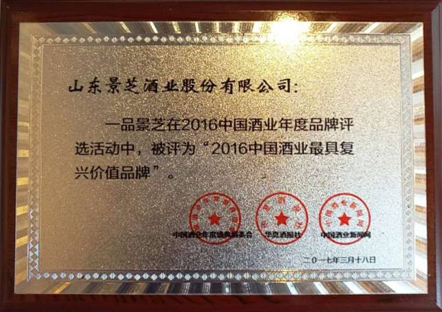一品景芝自问世以来,先后荣获中国白酒芝麻香型代表、国家地理标志保护产品、中国白酒著名创新品牌、中国轻工业科技成果一等奖等国家级荣誉,是上海世博会山东馆唯一入展白酒,先后成为中国人民解放军驻港部队、驻澳部队专供酒,可谓荣耀无限,其高端品牌价值显而易见。此次一品景芝荣获“2016中国最具复兴价值品牌”可谓实至名归。
